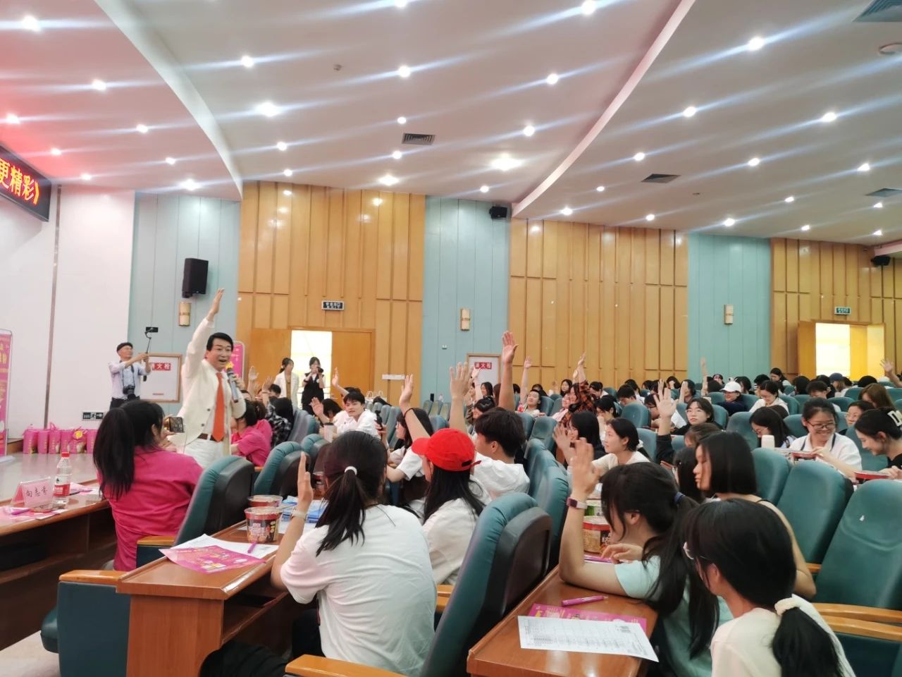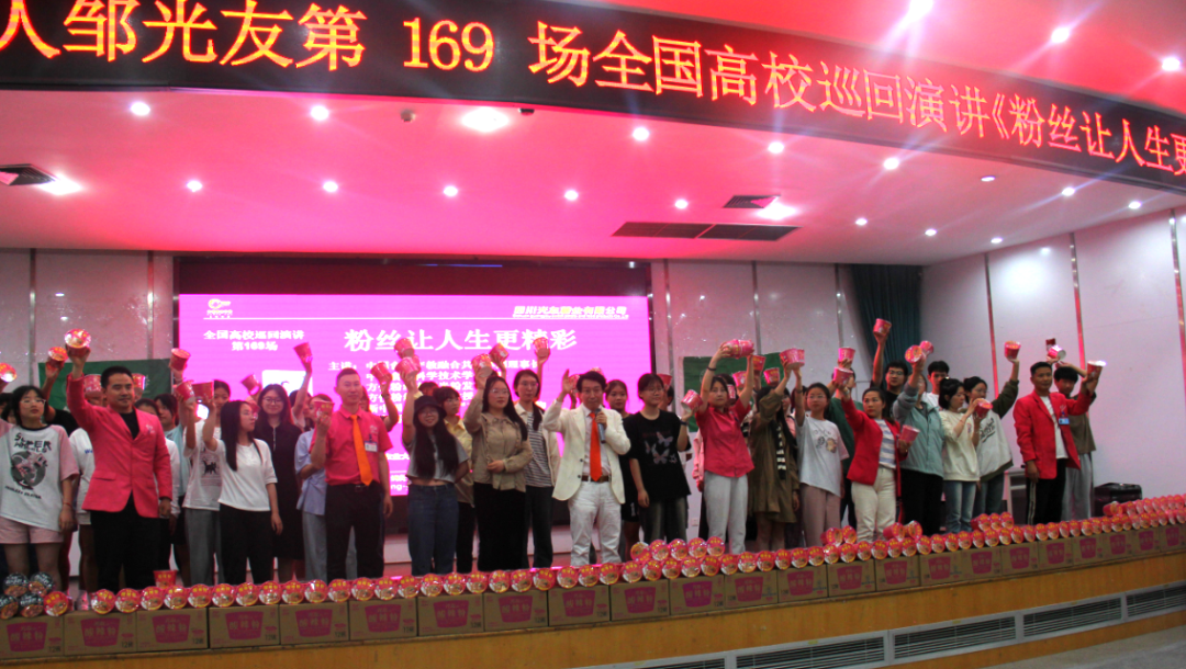 隨后,又進行了“改變從舉手開始”“與愿意創(chuàng)業(yè)的同學對話”“朗誦詩歌《粉絲心態(tài)》”“分享光友激情三寶”“共跳光友粉絲舞”“共讀意愿百分百詩”“贈送光友粉絲”等熱情互動活動,同學們的歡呼聲一浪高過一浪,現(xiàn)場氛圍逐步推向頂點。