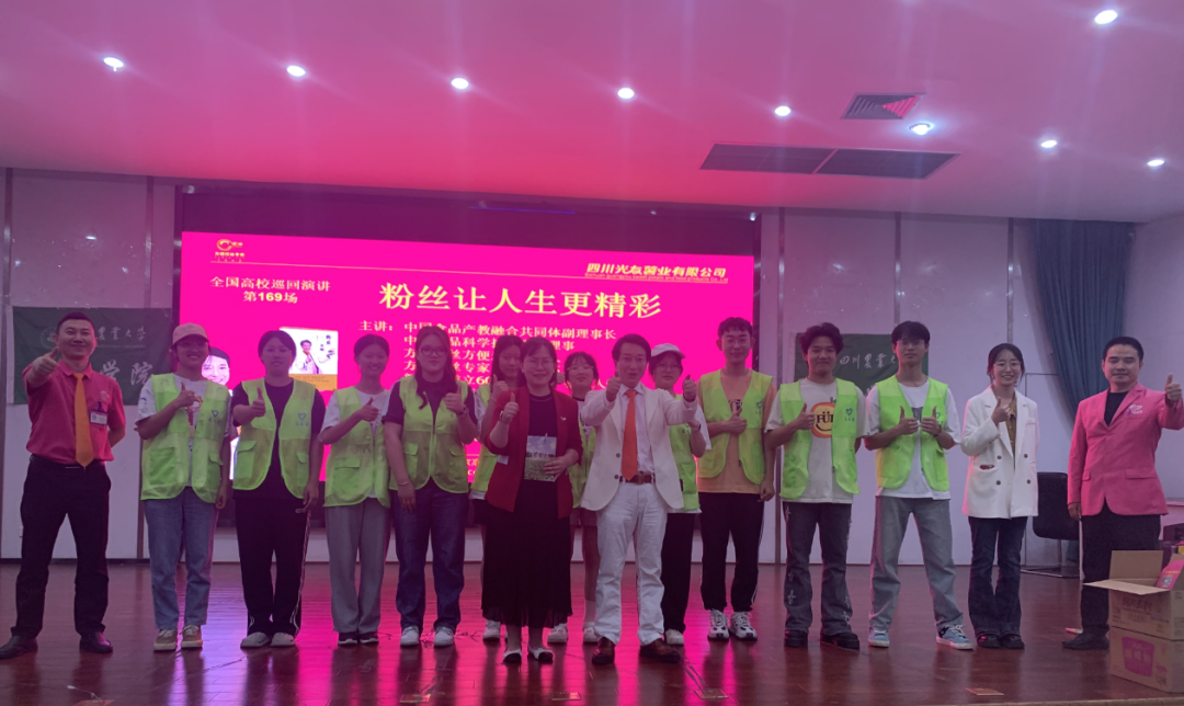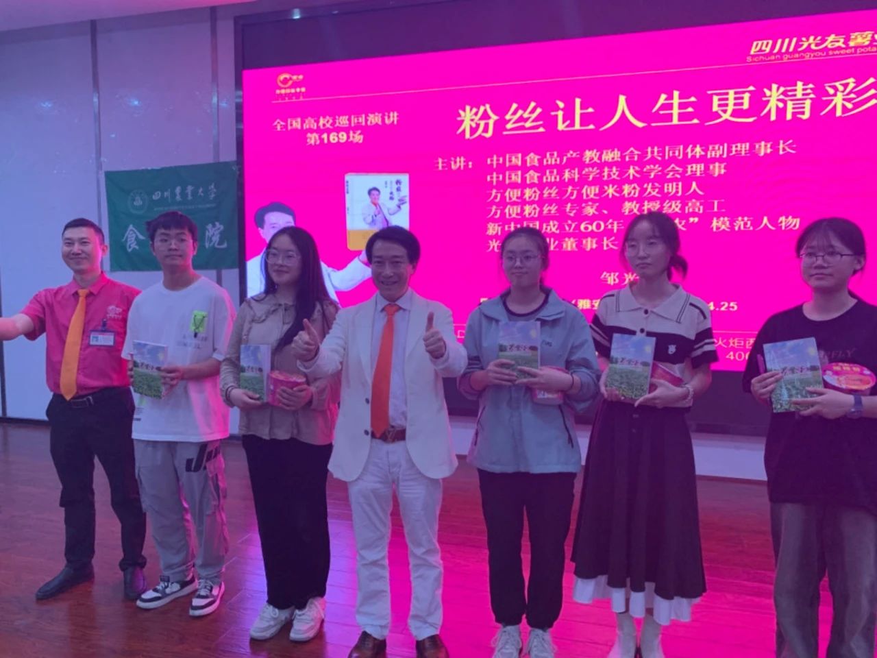 4月25日,陽光曜靈,和風容與。正是麗日當空時,光友薯業(yè)走進了綠意盎然、洋溢著青春活力的四川農(nóng)業(yè)大學食品學院,開展了校企深化合作交流座談會,組織考察校區(qū)各食堂、超市,中國食品產(chǎn)教融合共同體副理事長、中國食品科學技術(shù)學會理事、方便粉絲方便米粉發(fā)明人、方便粉絲專家、教授級高工、新中國成立60年“三農(nóng)”模范人物、光友薯業(yè)創(chuàng)始人、光友薯業(yè)董事長鄒光友鄒光友成功舉行了全國高校第169場創(chuàng)業(yè)勵志演講。