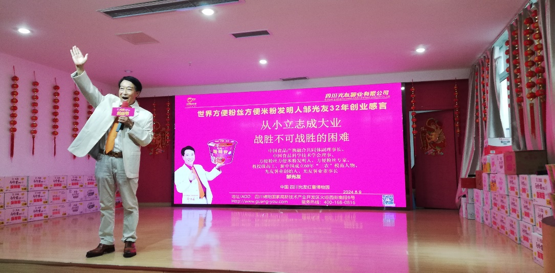 活動前預(yù)熱環(huán)節(jié),一段活力四射的光友粉絲舞視頻讓現(xiàn)場氣氛瞬間升溫。隨后,方便粉絲方便米粉發(fā)明人、光友薯業(yè)集團(tuán)董事長鄒光友發(fā)表熱情洋溢的歡迎辭,并深情分享《從小立志成大業(yè) 戰(zhàn)勝不可戰(zhàn)勝的困難》的感言,鼓勵小記者們勇于面對挑戰(zhàn)面對困難,追求夢想。在互動環(huán)節(jié),小記者們積極提問,鄒董事長一一耐心解答,并親手為提問的小記者們贈送《光友詩選》,每本書上都附有鄒董事長親筆簽名及溫馨寄語,傳遞著對下一代的殷切期望。
