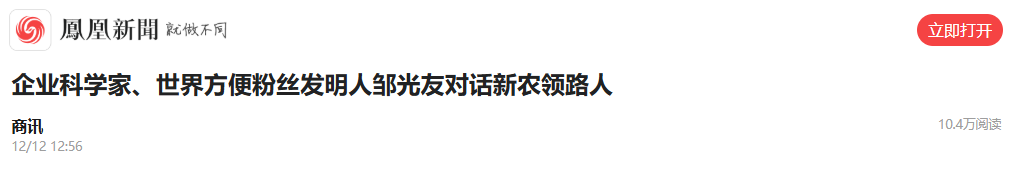 轉載鳳凰網(wǎng) -企業(yè)科學家、世界方便粉絲發(fā)明人鄒光友對話新農領路人